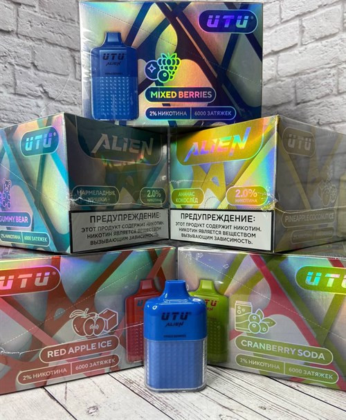 UTU Alien - 6000 затяжек Вкусы: Черника-малина-вишня Клубника-черника-вишня Лесные ягоды Энергетик Сахарная вата Клубничное мороженое Мята-лимон Ананас-кокос Красное яблоко - холодок Мармеладные мишки Манго-маракуйя Вишня-персик-лимонад Клюквенная содовая