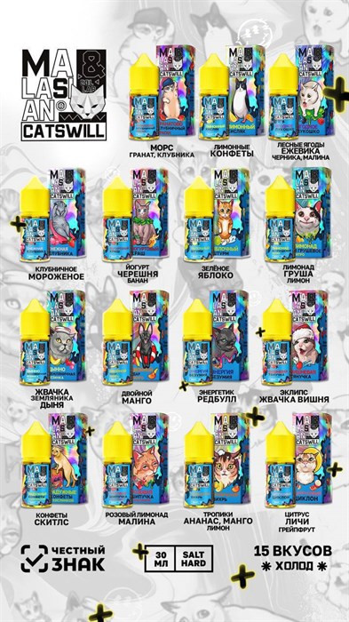 Жидкость Catswill & Malasian 30 мл 20 мг hard Вкусы: Морс гранат-клубника Лимонные конфеты Лесные ягоды, ежевика, черника, малина Лимонад груша, лимон Зелёное яблоко Йогурт черешня-банан Клубничное мороженое Жвачка земляника-дыня Двойной манго Энергетик р