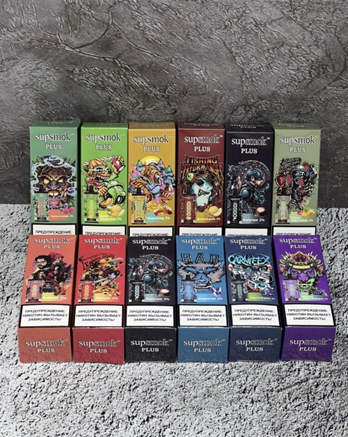 Supsmok Plus - 10000 затяжек Вкусы: Кофе Капучино Клубнично-арбузная жвачка Жареная курица Энергетик Дынный джем Пина Колада Скиттлз Черничный джем Дыня-манго-алое Манго-ананас Виноград-смородина Клубничное мороженое Мармелад Арбуз-холодок Ананас Персик-м