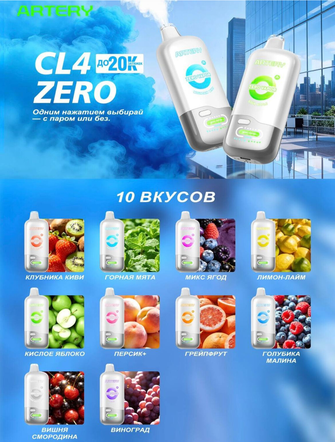 Artery CL4 ZERO предлагает широкий выбор вкусов: от свежих фруктовых до охлаждающих миксов, что делает его универсальным вариантом как для новичков, так и для опытных пользователей.